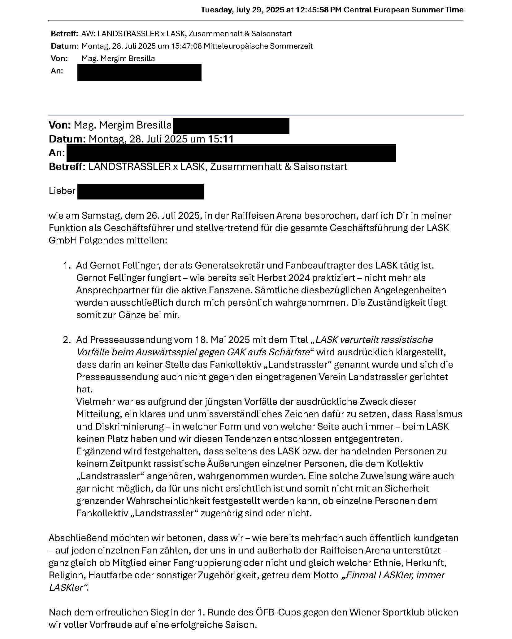 Die Geschäftsführung hat daraufhin am Tag des Cup-Spiels beim Wiener Sport-Club gemeinsam mit einem vermittelnden Fan und dem führenden Capo der Landstrassler sowie im Beisein eines Sponsorenvertreters zum wiederholten Male das gemeinsame Gespräch gesucht. Darin forderte der Capo unter anderem mehrfach eine erneute Stellungnahme des Vereins in Bezug auf die Rassismusvorfälle beim letzten Auswärtsspiel gegen den GAK, im Zuge dessen mehrere LASK-Profis von rassistischen Beleidigungen aus dem eigenen Fanblock berichtet hatten. Diese Vorfälle stellte er in Abrede. Der LASK vertraut seinen Spielern vollumfänglich und distanziert sich, wie in der damaligen Stellungnahme ausdrücklich festgehalten, entschieden von jeglicher Form des Rassismus. Zu keinem Zeitpunkt hat der Verein die möglichen Täter:innen den Landstrasslern zugeschrieben, wie auch aus dem angefügten Mailverlauf von Geschäftsführer Mergim Bresilla vom 28.07.2025 nochmals unmissverständlich hervorgeht (siehe auch Faksimile unten).