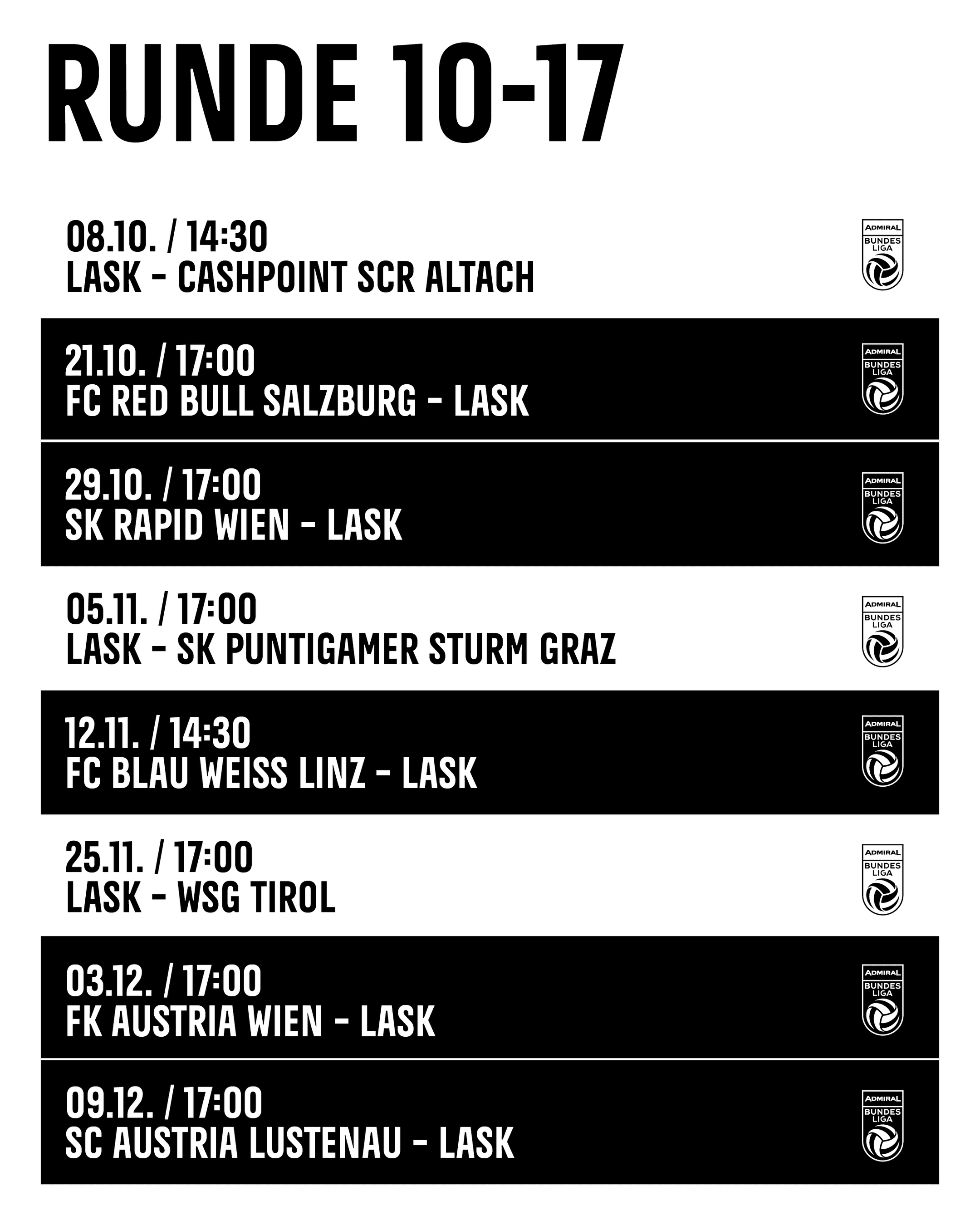 Der Spielplan für die kommenden Runden steht. Am 8.10., 5.11. und 25.11. spielen die Athletiker in der heimischen Raiffeisen Arena. Die Gegner in den Heimspielen lauten: CASHPOINT SCR Altach, SK Puntigamer Sturm Graz und die WSG Tirol. Fünfmal muss der LASK in der Fremde antreten. Zuerst geht es am 21.10. gegen Red Bull Salzburg. In der Woche darauf treten die Schwarz-Weißen beim SK Rapid Wien an. Am 12.11. gastieren die Stahlstädter zum Derby beim FC Blau Weiß Linz. Den Endspurt bestreiten die Schwarz-Weißen am 3.12. beim FK Austria Wien und 9.12. gegen den SC Austria Lustenau.