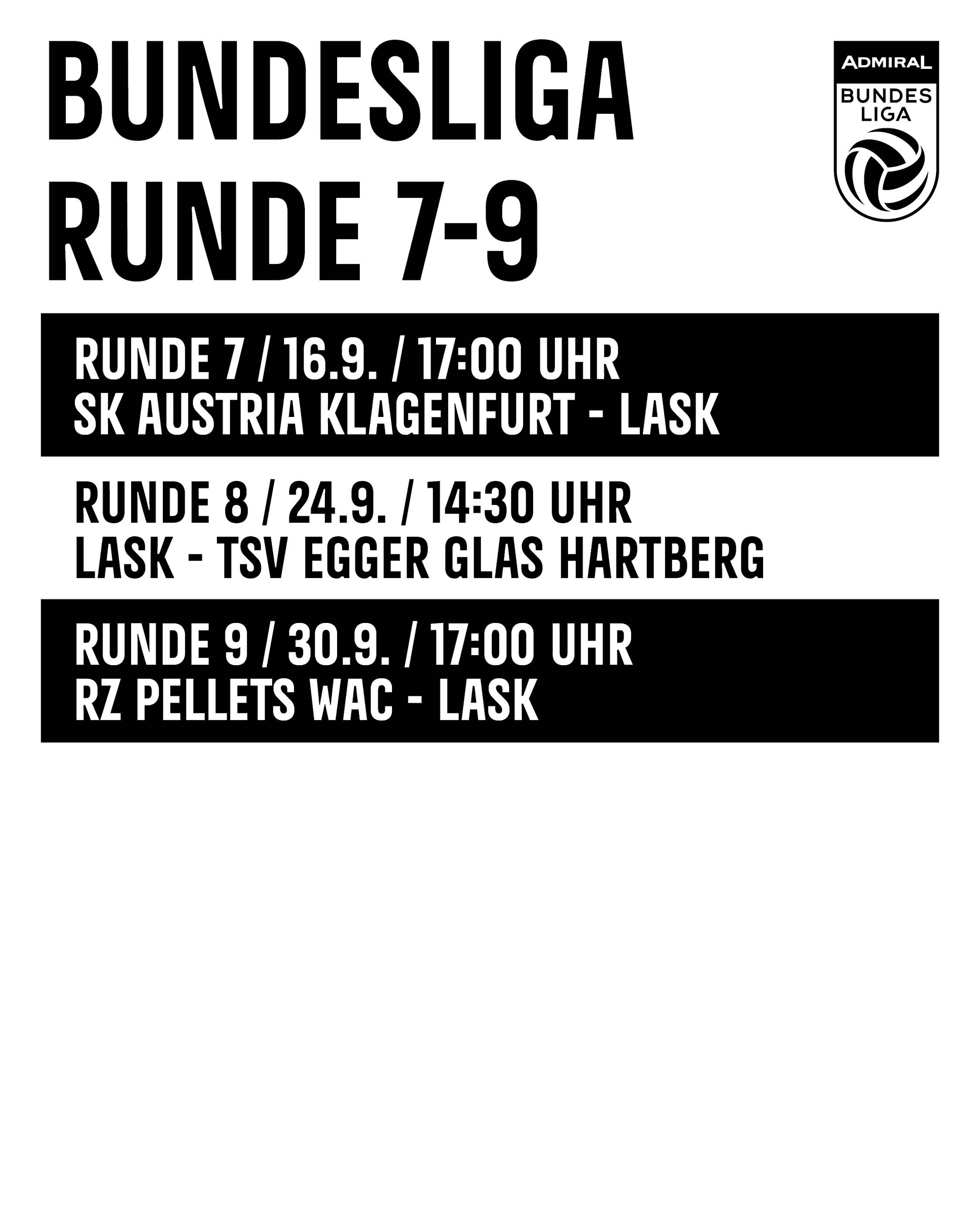 An den Spieltagen 7-9 tritt der LASK zwei Mal auswärts (Klagenfurt und Wolfsberg) und einmal zu Hause (Hartberg) an. Nun stehen die Spieltermine fest.