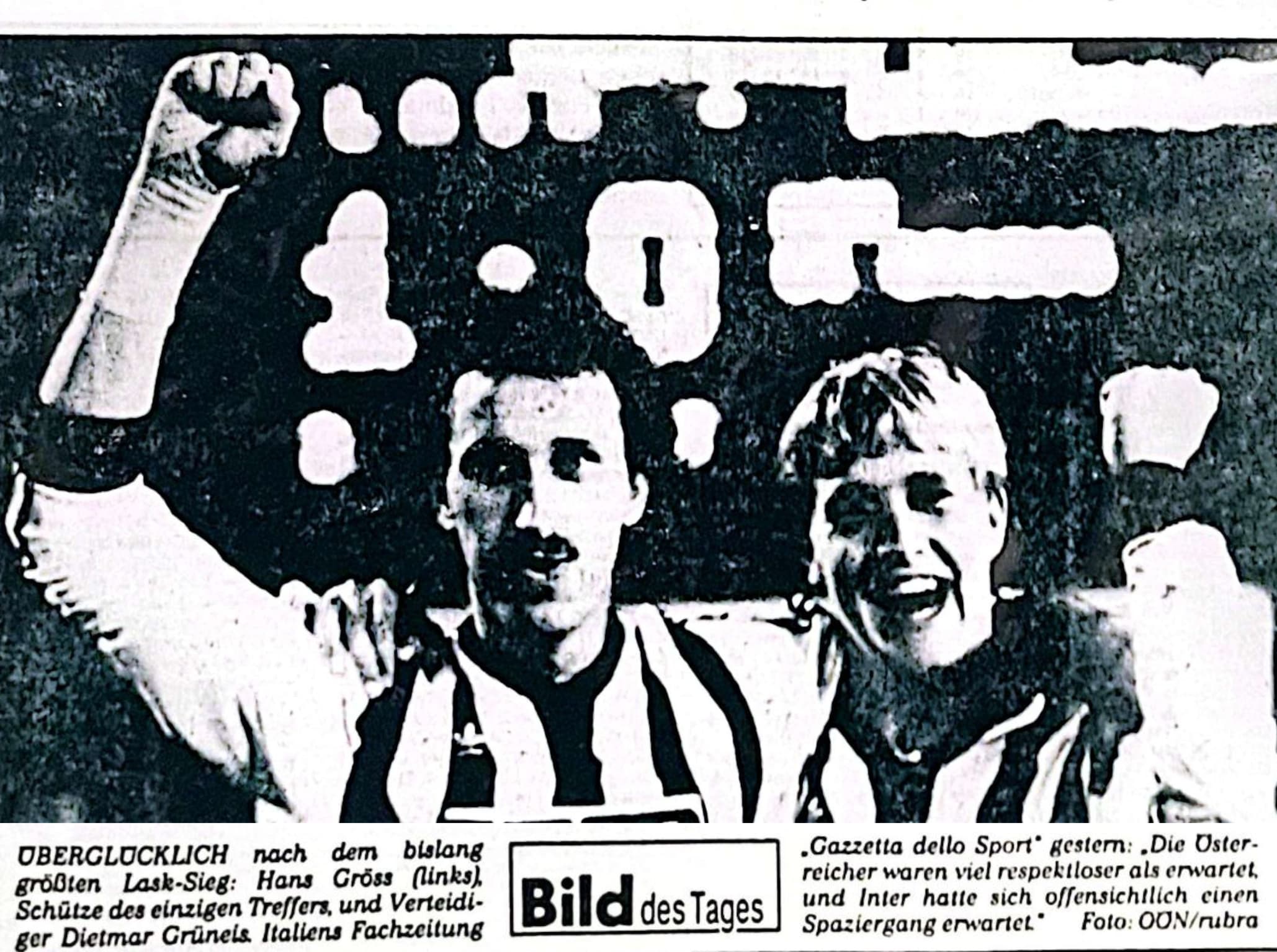 23. Oktober, 18.500 Zuschauer im Linzer Stadion und eine Rollenverteilung, wie sie deutlicher kaum hätte sein können. Auf der einen Seite vorwiegend Kicker, die wie Klaus Dantlinger in der OKA (der heutigen Energie AG) einem Brotberuf nachgingen, gegenüber die amtierenden italienischen Weltmeister um Giuseppe Bergomi, Fulvio Collovati, Marco Tardelli und Alessandro Altobelli, dazu Torhüter-Legende Walter Zenga oder der deutsche Topstürmer Karl-Heinz Rummenigge. Das Unterfangen in UEFA-Cup-Runde zwei schien beinahe aussichtslos, nicht so für die damaligen Protagonisten. „Wir Spieler haben wirklich an unsere Chance geglaubt, auch wenn sich die meisten nur gefragt haben, wie hoch der LASK verlieren wird“, sagte Gerald Piesinger, der den entscheidenden Treffer von Hans Gröss vorbereitet hatte, in einem späteren Interview.