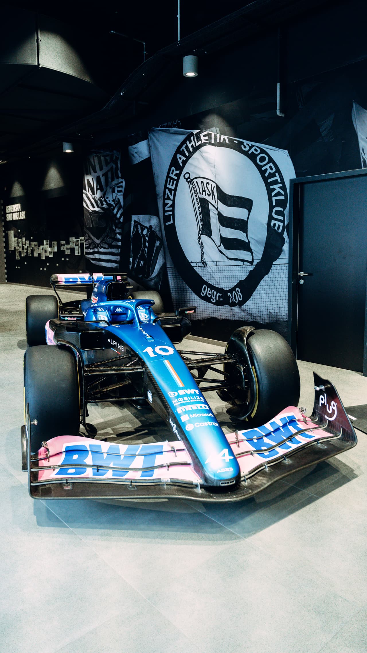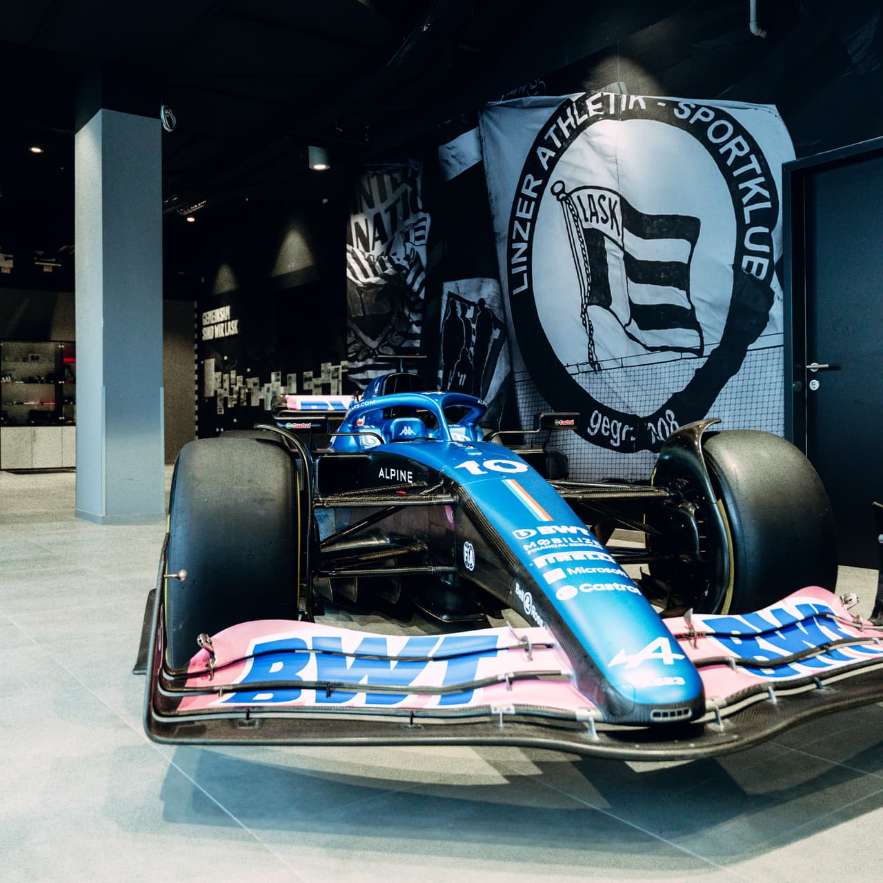 Ein Prachtwerk auf vier Rädern gibt es ab sofort in der Raiffeisen Arena des LASK zu bewundern. Der Formel-1-Bolide Alpine A523 ziert nun die Geschäftsstelle im Eingangsbereich des BWT Business Clubs.