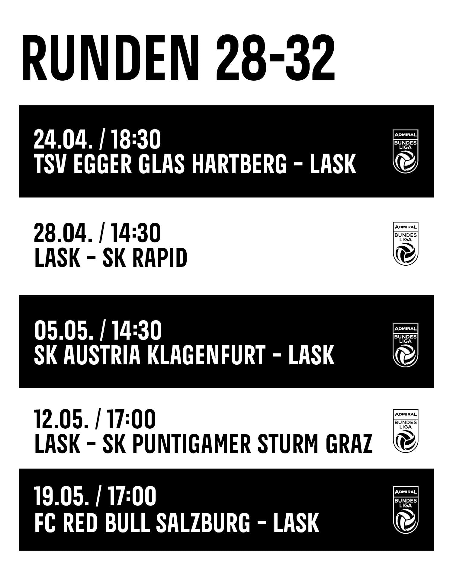 Der Spielplan enthält auch eine englische Woche: Drei Tage nach der Heimpartie am 21. April gegen Hartberg kommt es zum Retourmatch in der Oststeiermark, ehe am darauffolgenden Sonntag das zweite Aufeinandertreffen mit Rapid wartet. Den Abschluss des Finaldurchganges bildet das Gastspiel bei RB Salzburg am 19. Mai (zum Spielplan).
