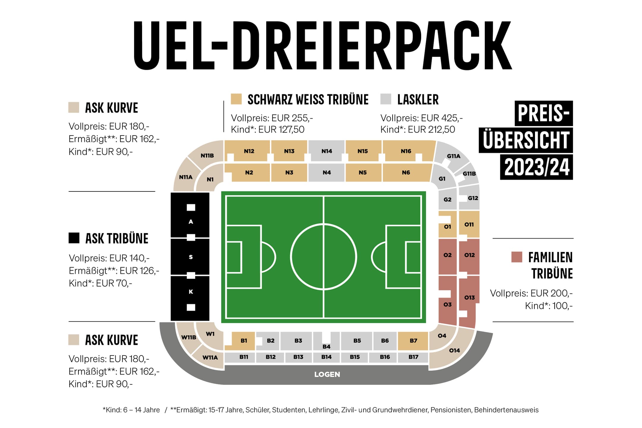 Von Freitag, 8. September um 20 Uhr bis Montag, 11. September um 19:08 Uhr , können LASKler-Abos, Abo-Plus und zusätzlich Abo-PUR exklusiv Dreierpacks für die Heimspiele in der UEFA Europa League erwerben. Tickets sind im Online-Shop, in der Geschäftsstelle in der Raiffeisen Arena (Öffnungszeiten) und im HYPO LASK Corner auf der Mozartkreuzung (Öffnungszeiten) verfügbar.