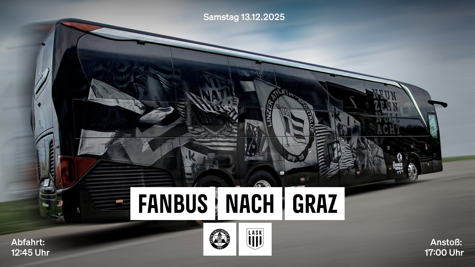 Das letzte Auswärtsspiel der Herbstsaison führt den LASK nach Graz: Dort treffen die Schwarz-Weißen am Samstag, den 13. Dezember, um 17.00 Uhr auf den GAK. Für das Match sind ab sofort Tickets erhältlich, darüber hinaus bietet der LASK auch einen eigenen Fanbus für die Reise in die steirische Landeshauptstadt an.