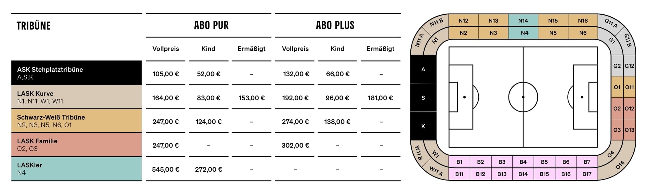 Kinder erhalten die Abos um die Hälfte des Preises. Ermäßigungen sind in der LASK-Kurve verfügbar.