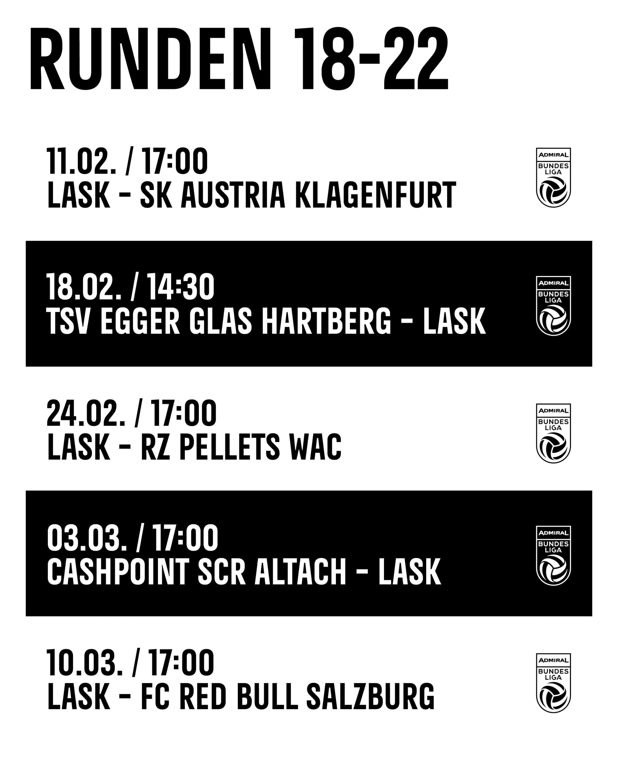 Das Bundesliga-Frühjahr beginnt für den LASK am Sonntag, den 11. Februar, mit dem Heimspiel in der Raiffeisen Arena gegen SK Austria Klagenfurt (17.00 Uhr). Eine Woche später gastieren die Athletiker ebenfalls am Sonntag (18. Februar) um 14.30 Uhr in Runde 18 beim TSV Hartberg, ehe es am Samstag, den 24. Februar, um 17.00 Uhr zum Heim-Duell mit dem Wolfsberger AC kommt.