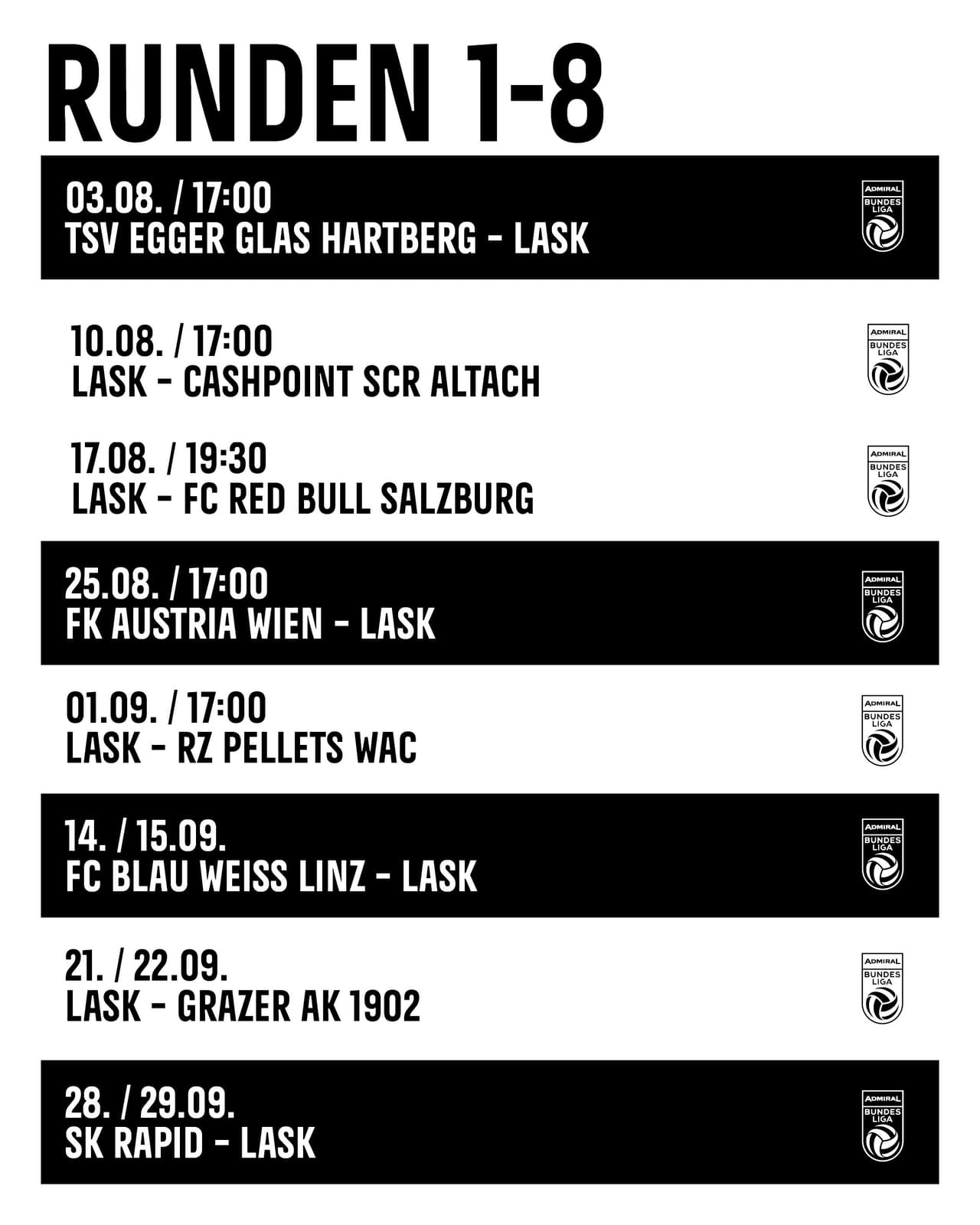 Das Auftaktspiel führt den LASK am Samstag, den 3. August, um 17.00 Uhr zum TSV Hartberg. Damit starten die Athletiker erstmals seit 2021 wieder mit einem Auswärtsmatch, damals hatte man beim SCR Altach mit 1:0 gewonnen. In den vergangenen fünf Eröffnungsspielen in der Bundesliga blieben die Linzer stets ungeschlagen.