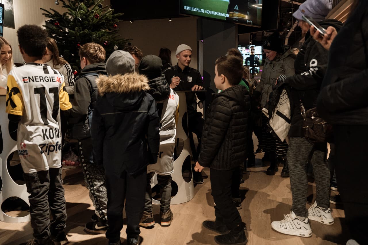 „Auf welchem Platz sitzt der Trainer beim Spiel?“, „Wie oft haben die Spieler Training?“, „Wie groß ist das Spielfeld?“ - diese und viele andere Fragen tauchten unter den zahlreichen begeisterten Kindern auf, die bei den Stadionführungen gemeinsam mit ihren Familien durch die Raiffeisen Arena schritten und ein Highlight nach dem anderen erlebten. Insbesondere der Ausflug in die Heimkabine des LASK ließ gleichermaßen staunende wie strahlende Gesichter aufblitzen. Im Spielertunnel schlüpften die Kids in die Rolle ihrer Idole und stellten den Gang auf das Spielfeld nach. Auf der Trainerbank nahmen die Mädchen und Burschen den Platz von Cheftrainer Markus Schopp ein, womit besagte Frage beantwortet war, in dieselbe Rolle schlüpften sie im Pressekonferenz-Raum, wo sie sich am Podium den imaginären Fragen der Journalisten stellten.