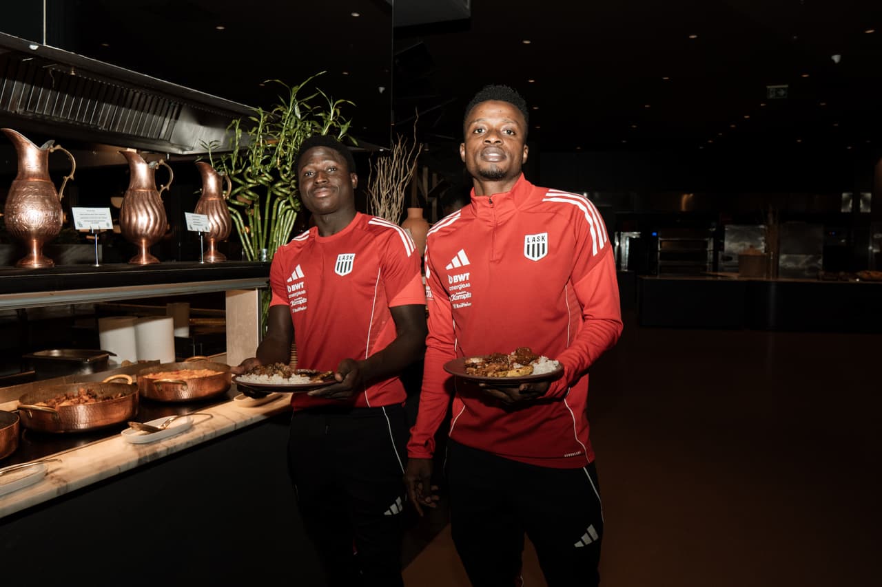 Pünktlich zum imaginären Krähen des Hahns enthüllten zwei LASK-Profis das Geheimnis des Vorabends: George Bello und Melayro Bogarde war es vorbehalten, in die Rolle der Social-Media-Administratoren zu schlüpfen und die schwarz-weißen Anhänger durch Tag acht zu führen. Eine wohlbedachte Entscheidung, wie sich herausstellte, wusste das Duo doch abwechslungsreiche Einblicke in den Alltag in Belek stets mit der nötigen Prise Humor zu vereinen. Zumindest, solange kein Wettbewerb auf dem Spiel stand, doch dazu später mehr. Schon bei der ersten Mahlzeit erwiesen sich die beiden als Brüder im Geiste, unterschied sich der Frühstücksteller mit Brot, Eiern und frischen Früchten sowie einem Glas Apfelsaft doch nur marginal. Während die Begutachtung der Aktivierungsübungen des Kollegen Danek zufriedenstellend ausgefallen war, hatte es den Zweien ein Mini-Shuttle angetan, um den eigentlich überschaubaren Weg zum Trainingsplatz zu bewältigen. Nur zu Kamerazwecken, versteht sich, jedoch nicht ohne zuvor des Zeugwarts Urteil über die örtlichen Gegebenheiten einzuholen. "Wir haben Top-Bedingungen, super Wetter, einen super Platz", gab dieser sogleich grünes Licht für Training Nummer zehn.
