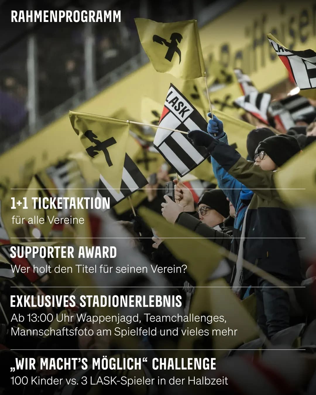 Bitte beachtet als Verein, dass der LASK ganzjährig bei jedem Bundesligaspiel 1+1 Aktionen für Vereine anbietet. Die Vereine können also ganzjährig kostengünstig die LASK-Bundesligaspiele besuchen.