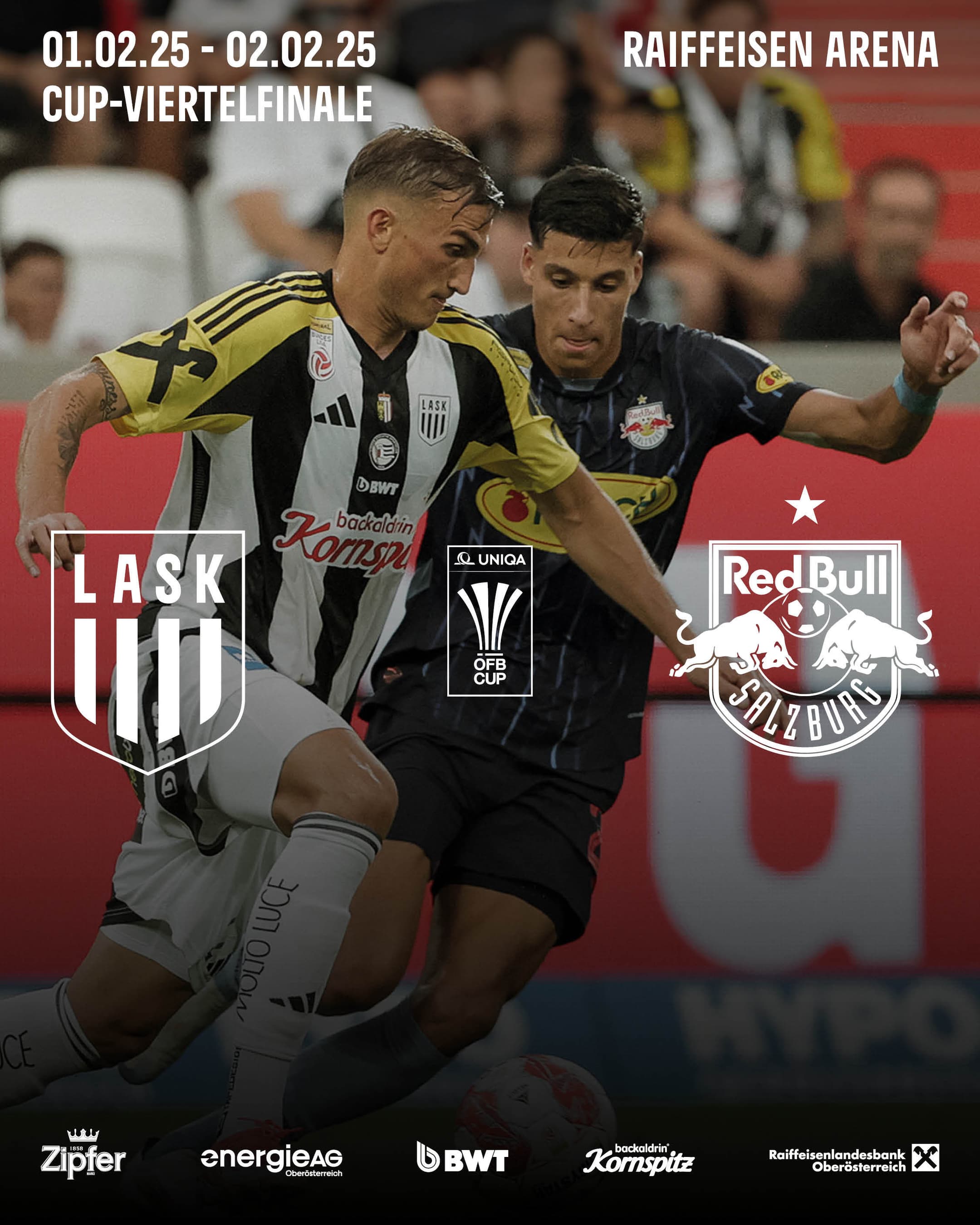 Bereits etwas mehr als zwei Stunden nach dem 2:1-Erfolg beim ASK Voitsberg kennt der LASK seinen Gegner für das Viertelfinale im UNIQA ÖFB-Cup. Wie die Auslosung am Mittwochabend ergab, bekommen es die Athletiker am 1./2. Februar in der heimischen Raiffeisen Arena mit RB Salzburg zu tun.