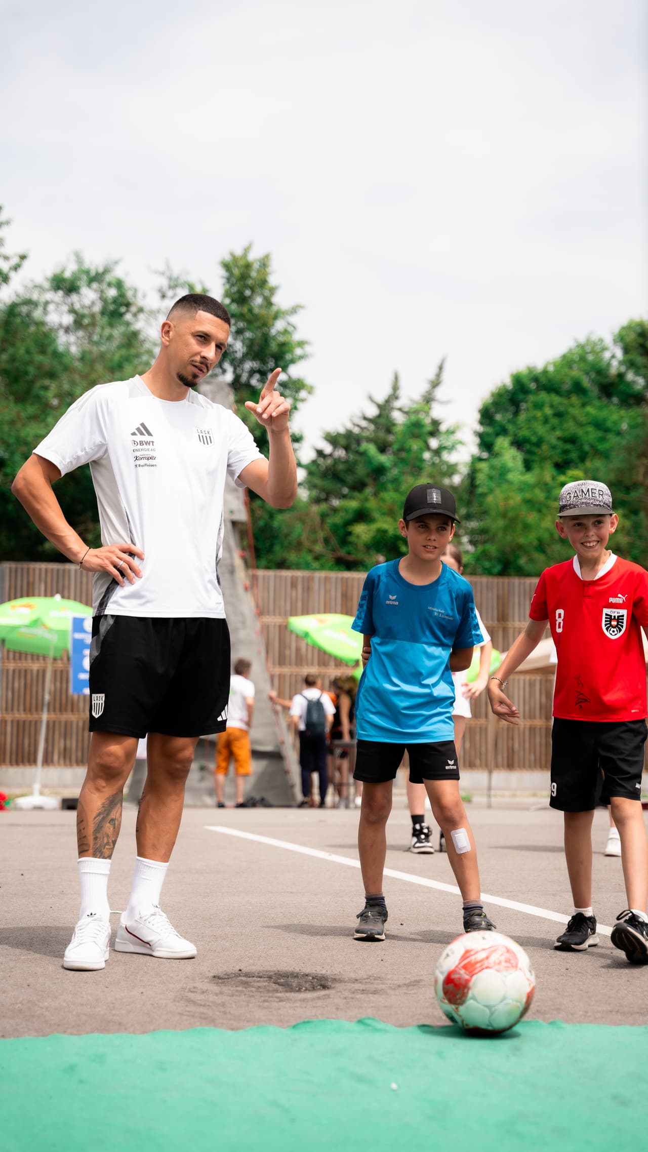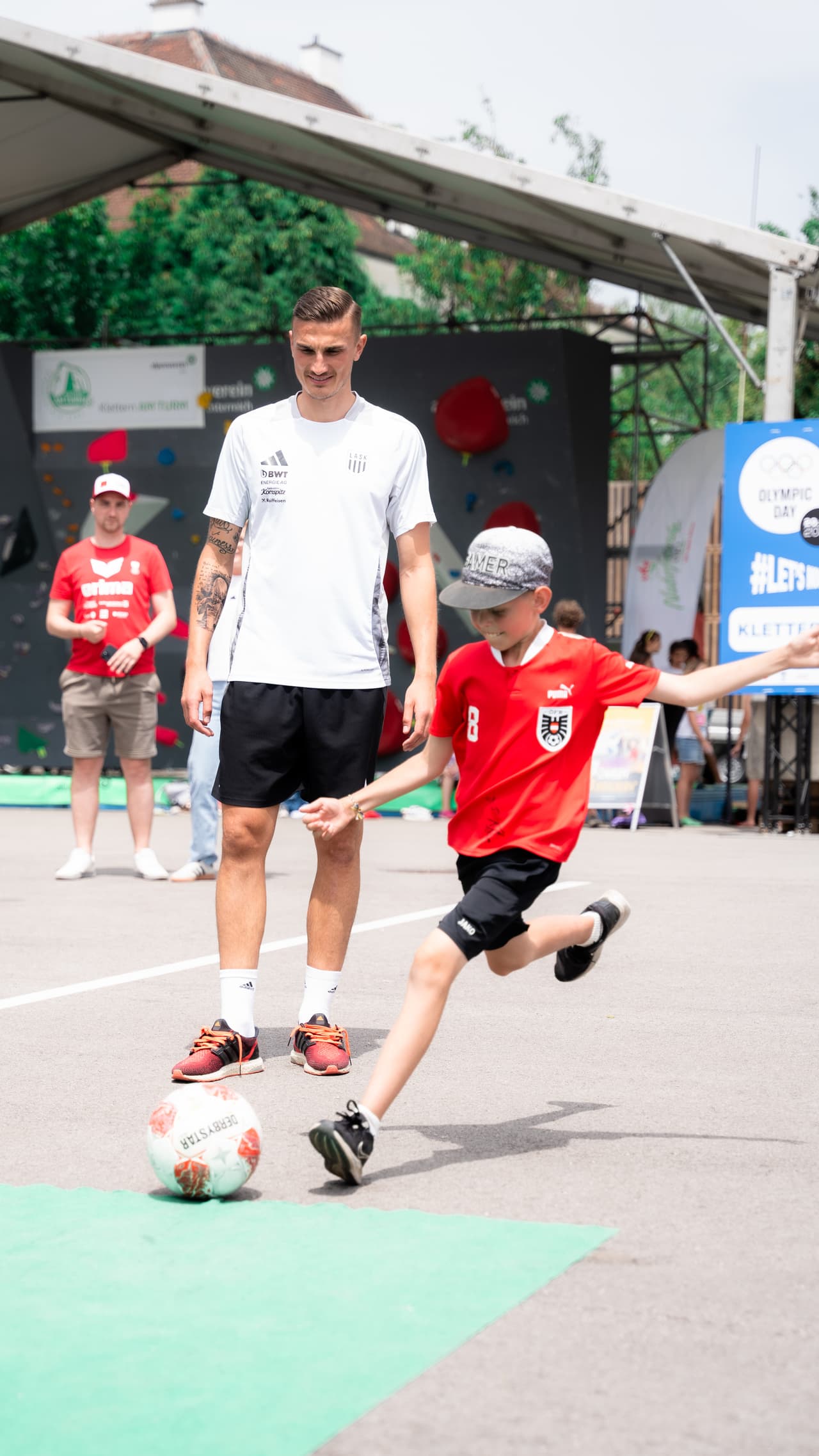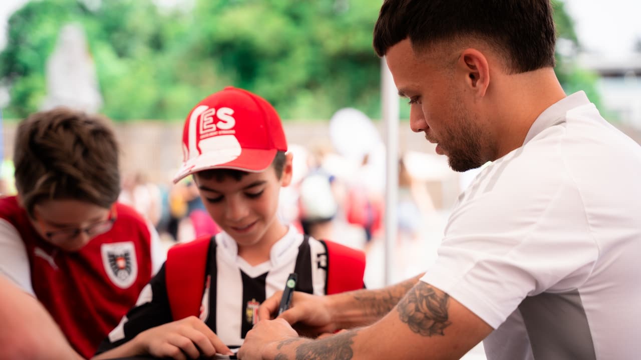 The LASK actively participated in the event, which combines the values of sports, family, and business, and is supported by leading partners such as Raiffeisenlandesbank OÖ and backaldrin. At noon, Captain Robert Zulj, Vice-Captain Philipp Ziereis, Florian Flecker, and Sascha Horvath were available for autographs in the press conference room of the Raiffeisen Arena and at the goal wall. Additionally, the kids received exclusive insights into the home stadium of LASK during stadium tours, which brought about shining eyes and radiant faces. The boys and girls were particularly excited to see the athletes' locker room.