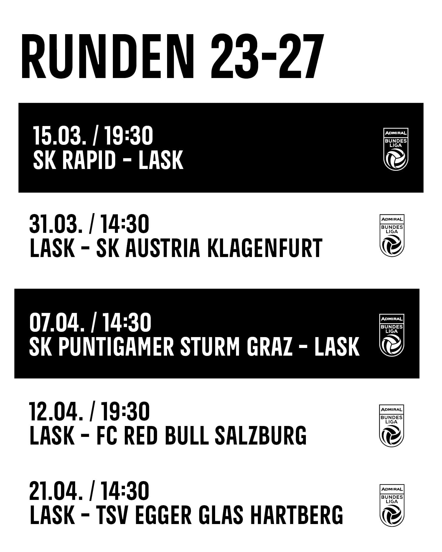 Der Spielplan enthält auch eine englische Woche: Drei Tage nach der Heimpartie am 21. April gegen Hartberg kommt es zum Retourmatch in der Oststeiermark, ehe am darauffolgenden Sonntag das zweite Aufeinandertreffen mit Rapid wartet. Den Abschluss des Finaldurchganges bildet das Gastspiel bei RB Salzburg am 19. Mai (zum Spielplan).