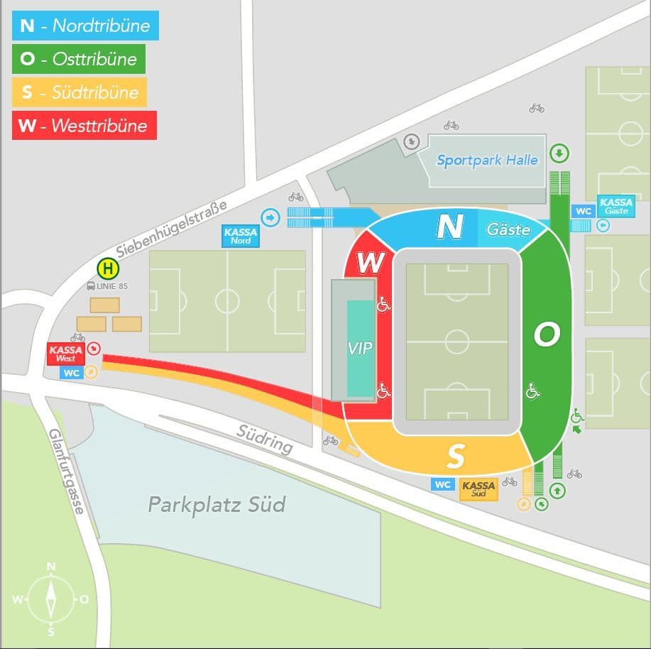 Wir empfehlen den Zugang zur Südtribüne sowie zum Sektor B1 über die Rampe am Westeingang. Bitte beachtet die Sektorentrennung auf der Südtribüne zwischen Ober- und Unterrang. Bitte meidet bei möglichen Fußmärschen zum Wörtherseestadion die Siebenhügelstraße.